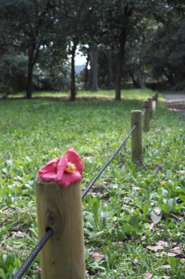 「浜離宮にて。桜花や菜花咲き誇る中、視界に飛び込む落花の椿。こういう遊びごころも良いもんだ」
