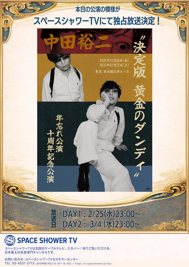 12月26日(金)・27日(土)の2日間、東京:日本橋三井ホールにて開催されました「年忘れ公演十周年記念公演 ”決定版 黄金のダンディ” 」の、CSチャンネル「スペースシャワーTV」での独占放送が決定しました。